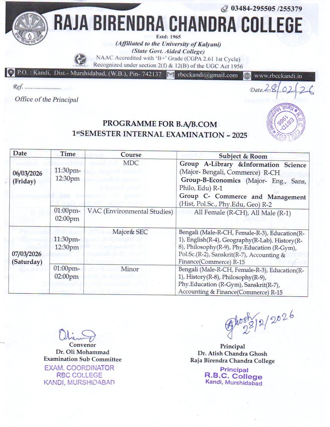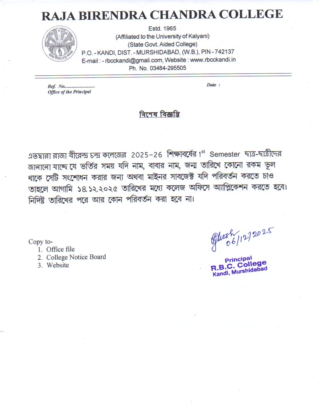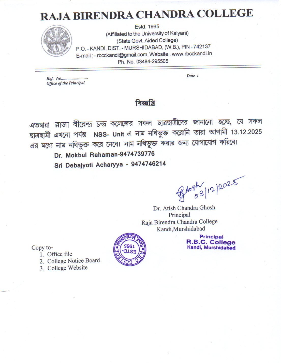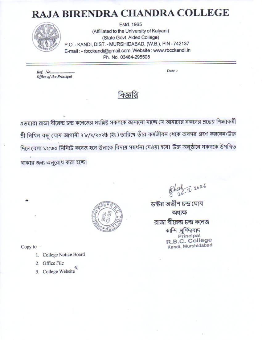 Birendra Chandra Sinha), the then President of the Governing Body of Kandi Raj College of