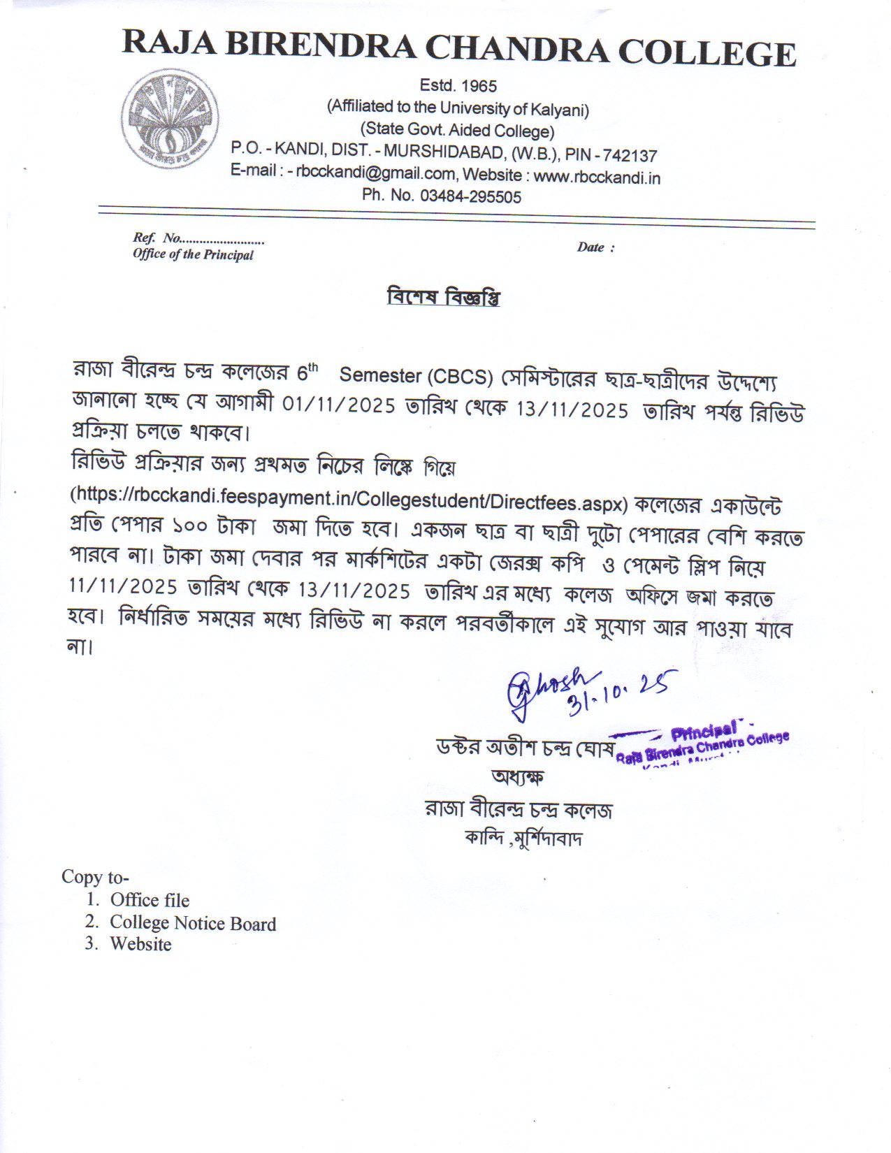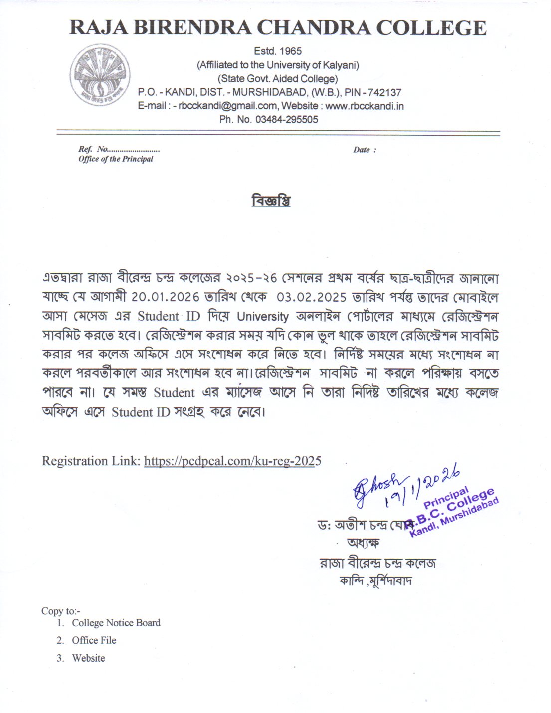 Birendra Chandra Sinha), the then President of the Governing Body of Kandi Raj College of