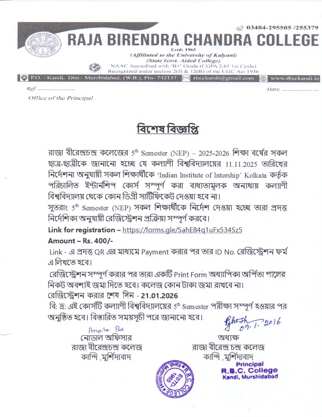 | 42 | U.G. 2nd Semester (NEP) Exam form fill up Re-opened Circular | 11/09/2025 | |